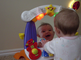 Kate waves bye-bye now. Oh! and she has figured out the oh and oo sounds. So she says "whoa" all the time. It's so cute. She also shakes her head "no" when we ask her certain questions. She doesn't know that she is saying "no" though, we don't think anyway. It's fun to ask her really silly questions like, "Kate. Do you have eyes?" And she'll just shake her head. She's not very good at doing this in front of an audience, but we got it on tape so I'll have to show you sometime.